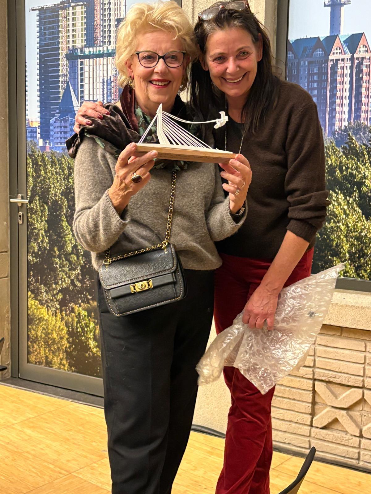 Op onderstaande foto zien we Alice Groen met het Wijkraadslid en BOS bestuurslid Desirée Otten en de toegekende award, een beeldje van de Erasmusbrug met een schommelende persoon.