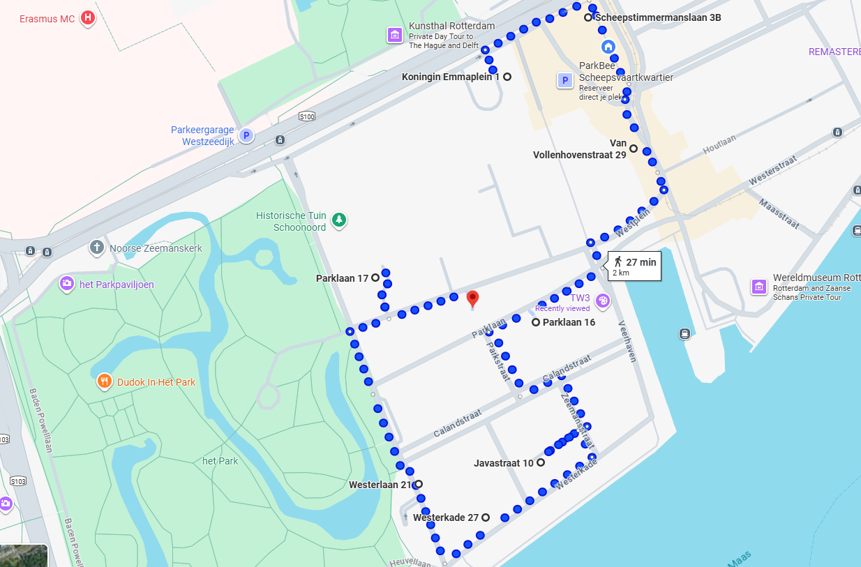 »»» We lopen verder op de Parklaan en gaan linksaf de Parkstraat in. We steken de Calandstraat over en gaan linksaf de Calandstraat in en gaan rechtsaf de Zeemansstraat in en vervolgens rechtsaf de Javastraat in (privéterrein) en stoppen bij nr. 10.