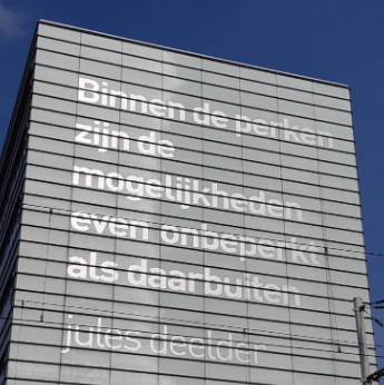 Van Deelder waren dichtregels te bewonderen op twee plekken in de wijk. Helaas is over de dichtregels op het gebouw aan de overkant een verflaag gegaan. Er stond: “Binnen de perken zijn de mogelijkheden even onbeperkt als daarbuiten”. Het is ons nog niet gelukt de dader op te sporen en de tekst terug te krijgen. We komen Deelder straks nog tegen bij het belastingmuseum aan de Parklaan.