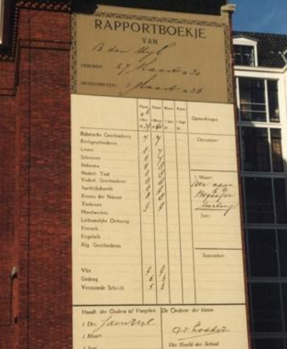 Schoolrapport op gevel van de Oude Bibliotheek