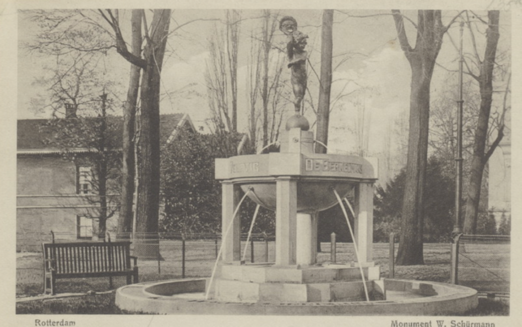 Na Schürmanns vroege overlijden werd besloten een gedenkmonument op te richten. Het werd de fontein op de Parklaan, ontworpen door beeldhouwer Charles van Wijk. Vier zuilen dragen een waterbassin waarboven zich een engeltje in brons bevond met een Melpomene masker in haar hand (Melpomene is de muze van de tragedie, een verwijzing naar de serieuze kant van zijn schrijven). Rondom het bovenste fonteinbekken zijn de titels uitgebeiteld van de boeken die Schürmann bekendheid gaven: ‘De Berkelmans’, ‘De Violiers’, ‘Paddenstoelen’ en ‘Veertig’. Op 18 oktober 1916 is de fontein onthuld; ‘s avonds werd in de Grote Schouwburg Schürmann’s toneelwerk ‘De Violiers’ opgevoerd.